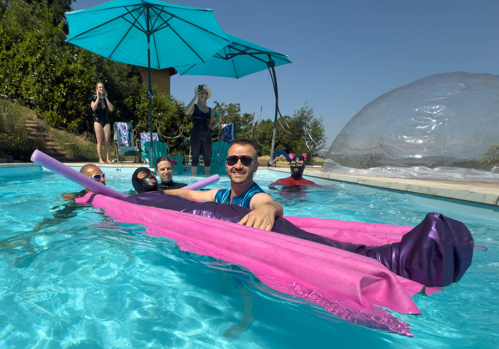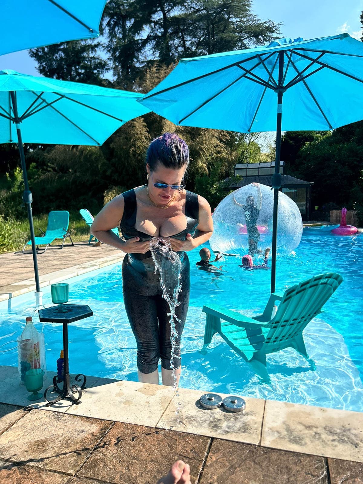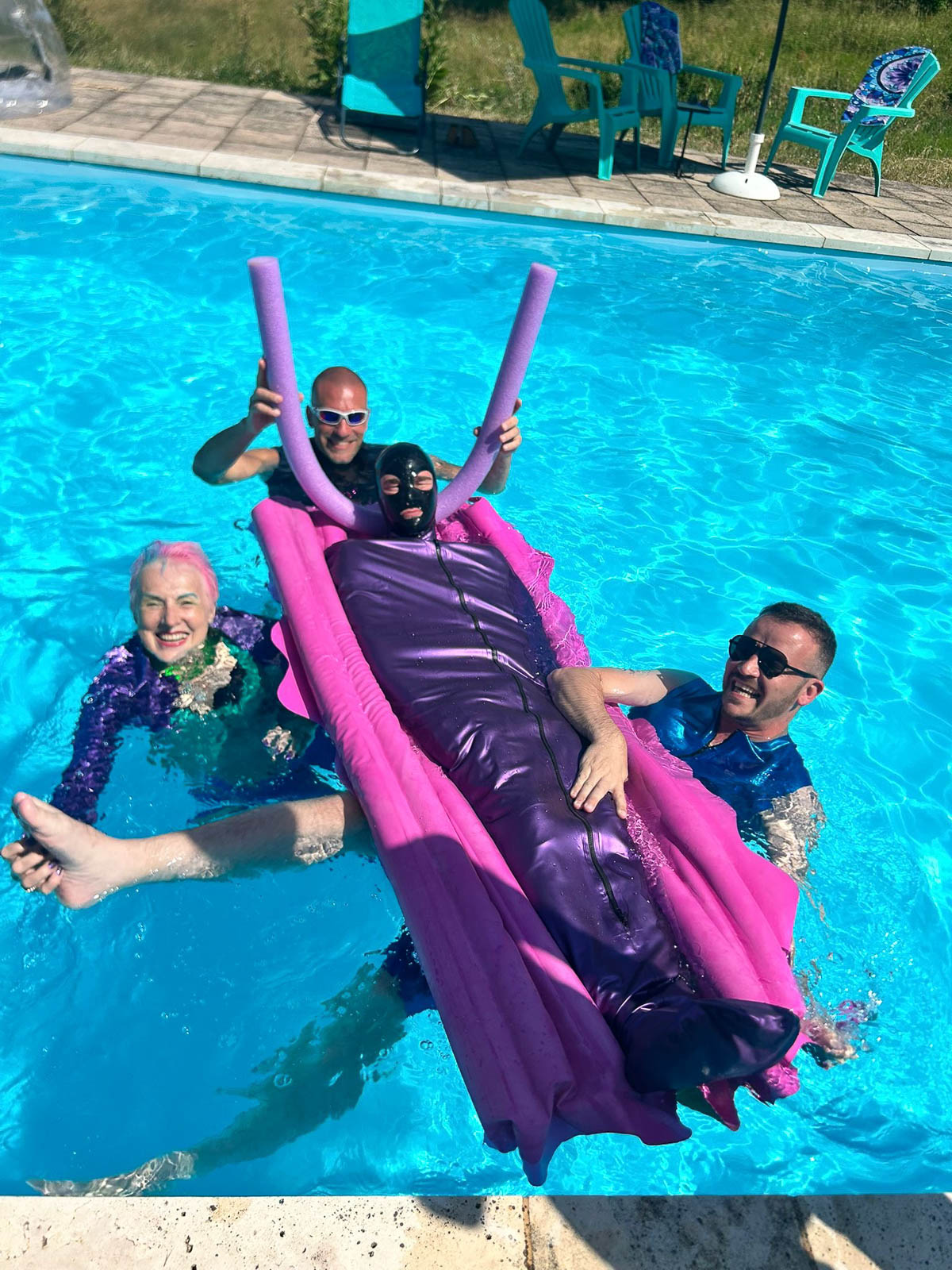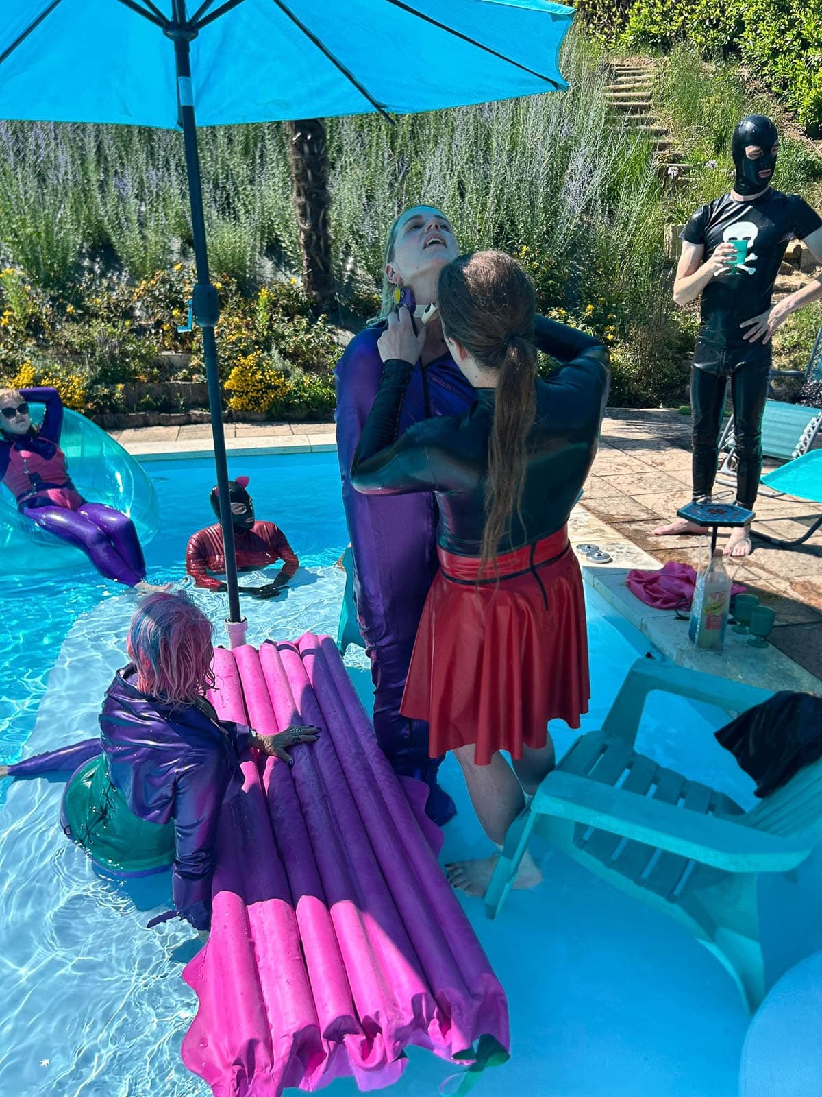Fortunately it stayed sunny enough for my season finale “intimate latex-only pool and play party weekend”. The rain held off until dinner, which we simply moved inside. It was a full house with guest rooms all occupied. My vision of “La Domaine de L’esprit » is slowly coming to fruition with guests from around the world: India, Germany, the U.S., and all over France.