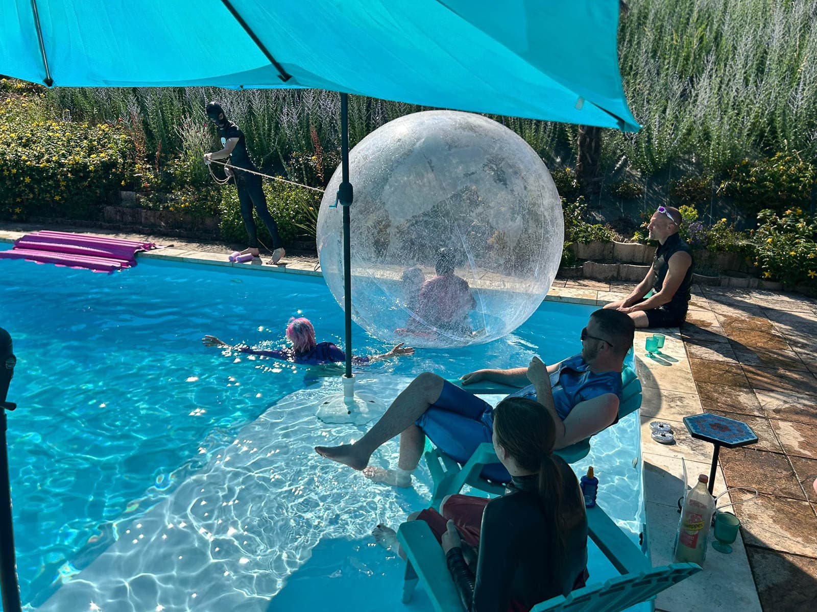 Évidemment, ce sont les gens qui font la fête. Un grand merci aux kinksters qui croient en ma vision et veulent en faire partie ! Tout le monde a aidé en fonction de ses compétences : Le donjon est maintenant entièrement fonctionnel. Il dispose même d’une salle de bain complète, mais sans murs pour l’instant. Robin, fétichiste et constructeur de latex, a fourni des balles en plastique de taille humaine pour la piscine, ainsi que d’étranges engins en caoutchouc pour la fête d’après-dîner.