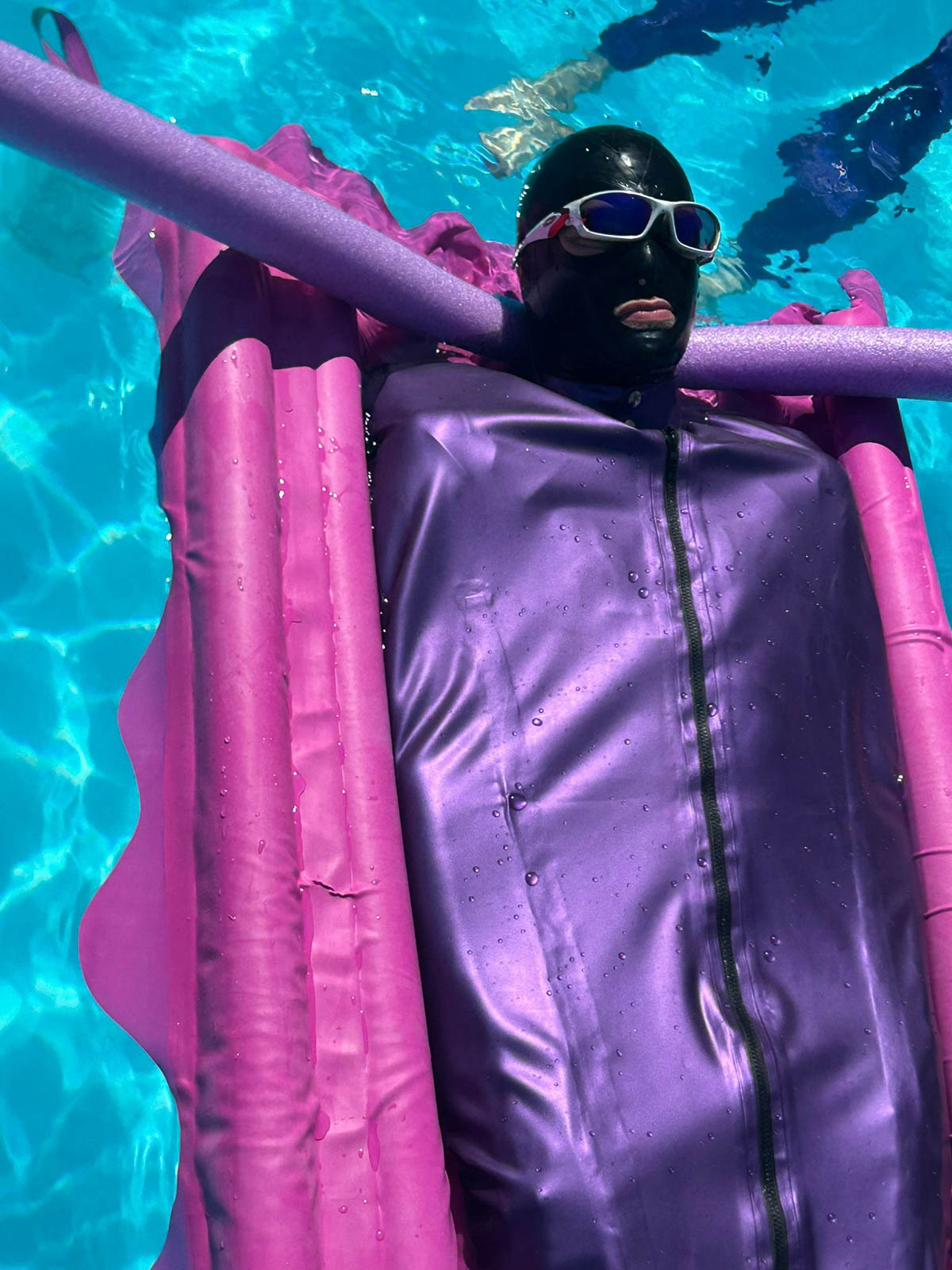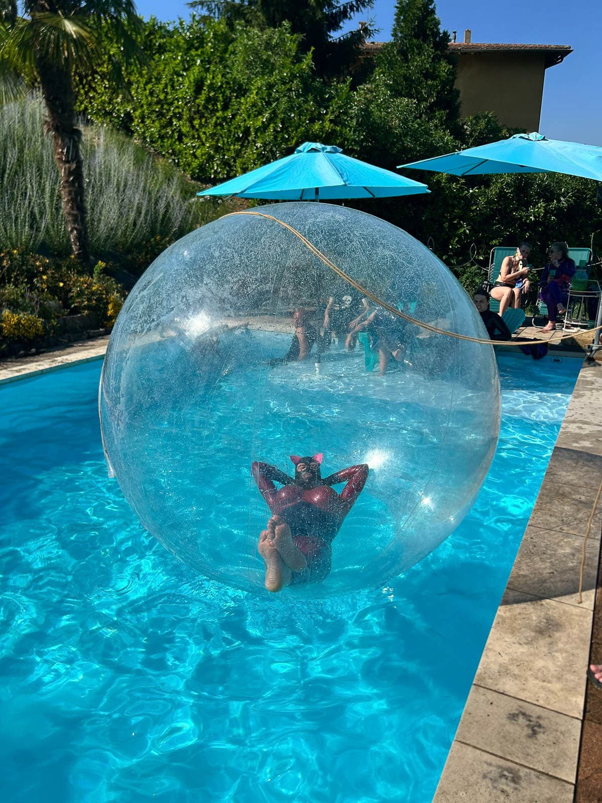 Arrive at 2pm, enjoy a glass of Crémant (from our local vineyard), slip into your latex and join your fellow fetishists. Never experienced the incredible sensations of water and latex? It’s indescribable! Roll around in a giant transparent ball, float in an inflatable straitjacket, or just relax. Light refreshments and drinks will be available.