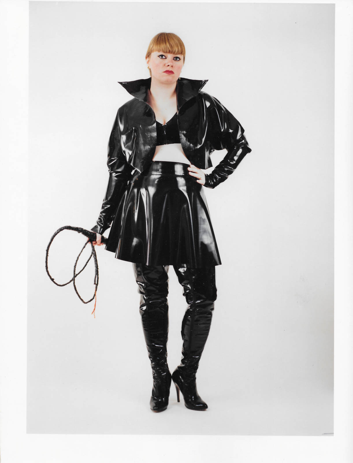 Johan sent us these photos of Francie wearing The Baroness Latex skating skirt and our wired collar Bolero Jacket. For me, the best part is these photos are printed large and hanging in their home.